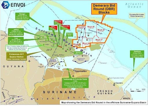 De acordo com Staatsolie, os dados obtiveram pontos para offshore do Suriname contendo até 30 bilhões de barris de recursos equivalentes de petróleo recuperáveis. A empresa petrolífera nacional e reguladora da indústria Staatsolie lançou recentemente a Rodada de Licitações Demerara 2022/2023 com licitações encerradas em 31 de maio de 2023. Ela é composta por seis blocos, 63 a 68, no offshore do Suriname, localizado a nordeste dos blocos de águas profundas existentes, onde descobertas foram feitas.